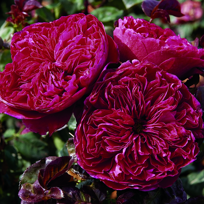 (Plant Patent #14039, Var: MEIkarouz) Deep burgundy buds open to reveal perfectly quartered, old-fashioned blooms that are bright raspberry-red without purplish hues so typical of this type of rose. The flowers hold up well in rain and heat, wafting their sweet fragrance of citrus and fresh ripe berries. The bushy plants are densely clothed with deep green foliage. Winner of the Fragrance Award at the Rose Hills International Rose Trials in 2003. Hybridizer: Meilland®, 2000