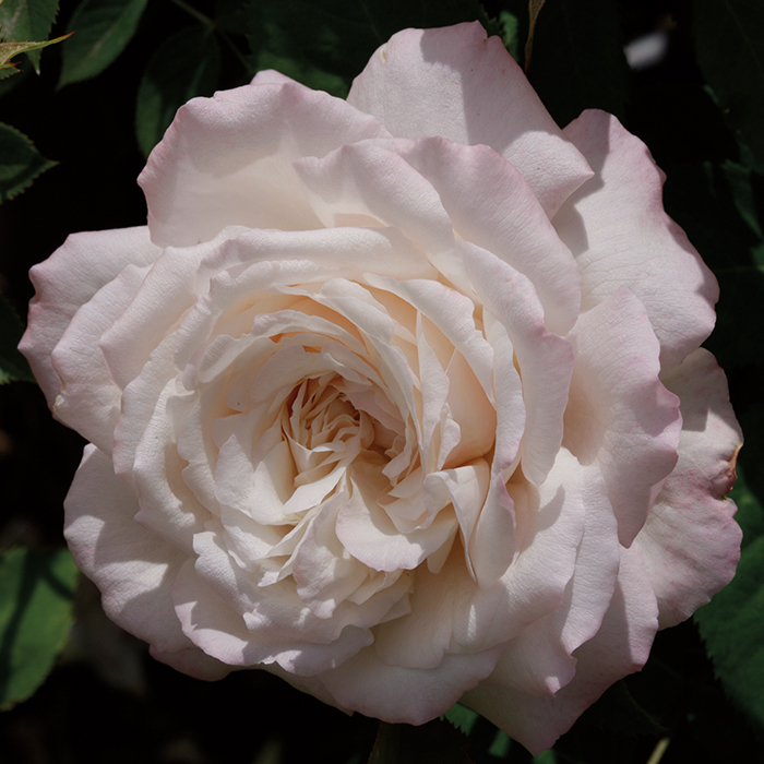 (P.P.27244, Var: BBARE) Discovered in a Texas nursery, this voluptuous new beauty is a naturally occuring sport of Belinda's Dream. Her blooms are a creamy white confection with whispers of pink on the petal edges. Bushy, upright plants have healthy green foliage that holds strong against powdery mildew, rust, and downy mildew. Don't expect the best performance if you live where summers are scorching, but for those in cooler spots, this one looks like a dream come true.