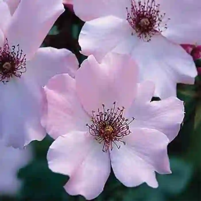 A five-petalled creamy pink flower with showy burgundy stamens whose airy clusters have all the elegance of a flight of tropical birds. Tall, upright, hardy plants are clothed in cast iron, grayish green, leathery foliage. An ageless beauty that has become a classic and a perennial favorite among artists who capture the beauty of the rose. Hybridizer: Archer, 1925